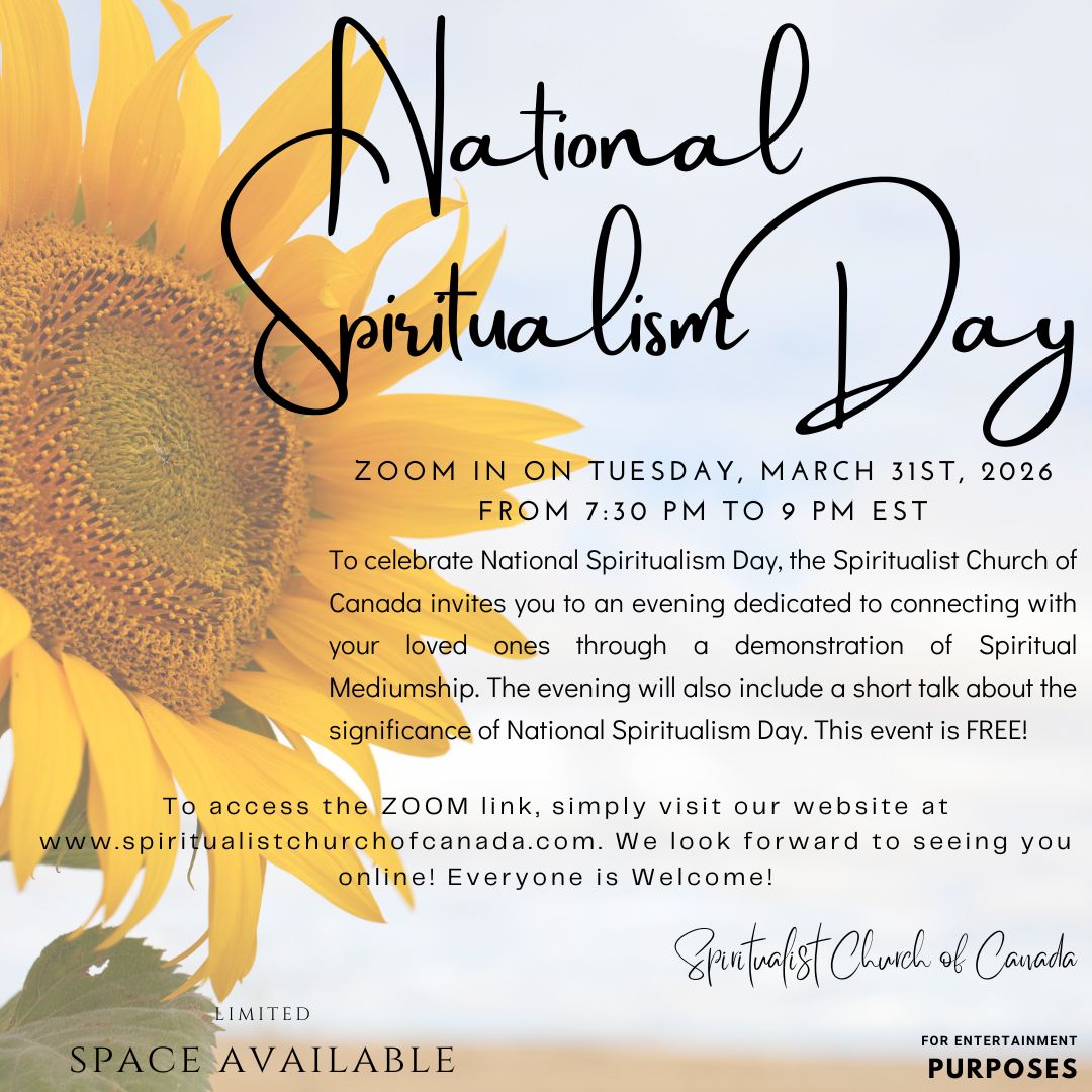 To celebrate National Spiritualism Day, the Spiritualist Church of Canada invites you to an evening dedicated to connecting with your loved ones through a demonstration of Spiritual Mediumship. The evening will also include a short talk about the significance of National Spiritualism Day.